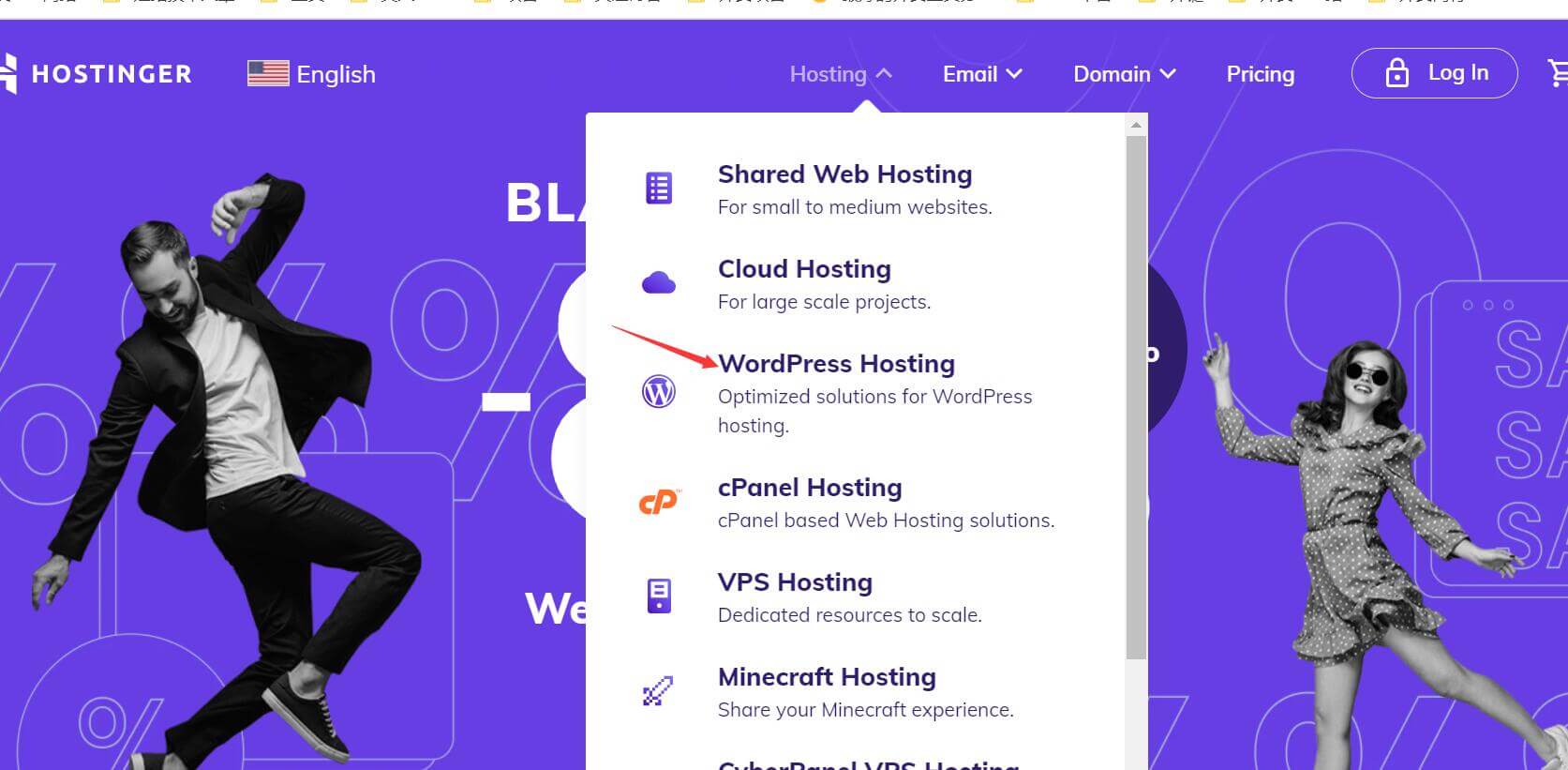 打开Hostinger官网,点击顶部菜单Hosting, 然后选择Wordpress Hosting。