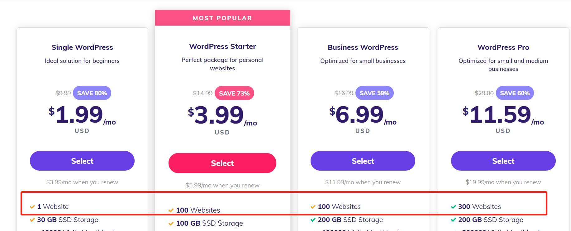 Hostinger针对wordpress网站推出来四款虚拟主机,如果你只有一个网站,就选择第一个套餐,1.99美金一个月的,它提供30GB 的SSD储存空间,对于单个外贸网站,足够用了。如果你有多个网站要做,那就选择第二款主机,这种支持100个网站使用,提供100GB的SSD储存空间。