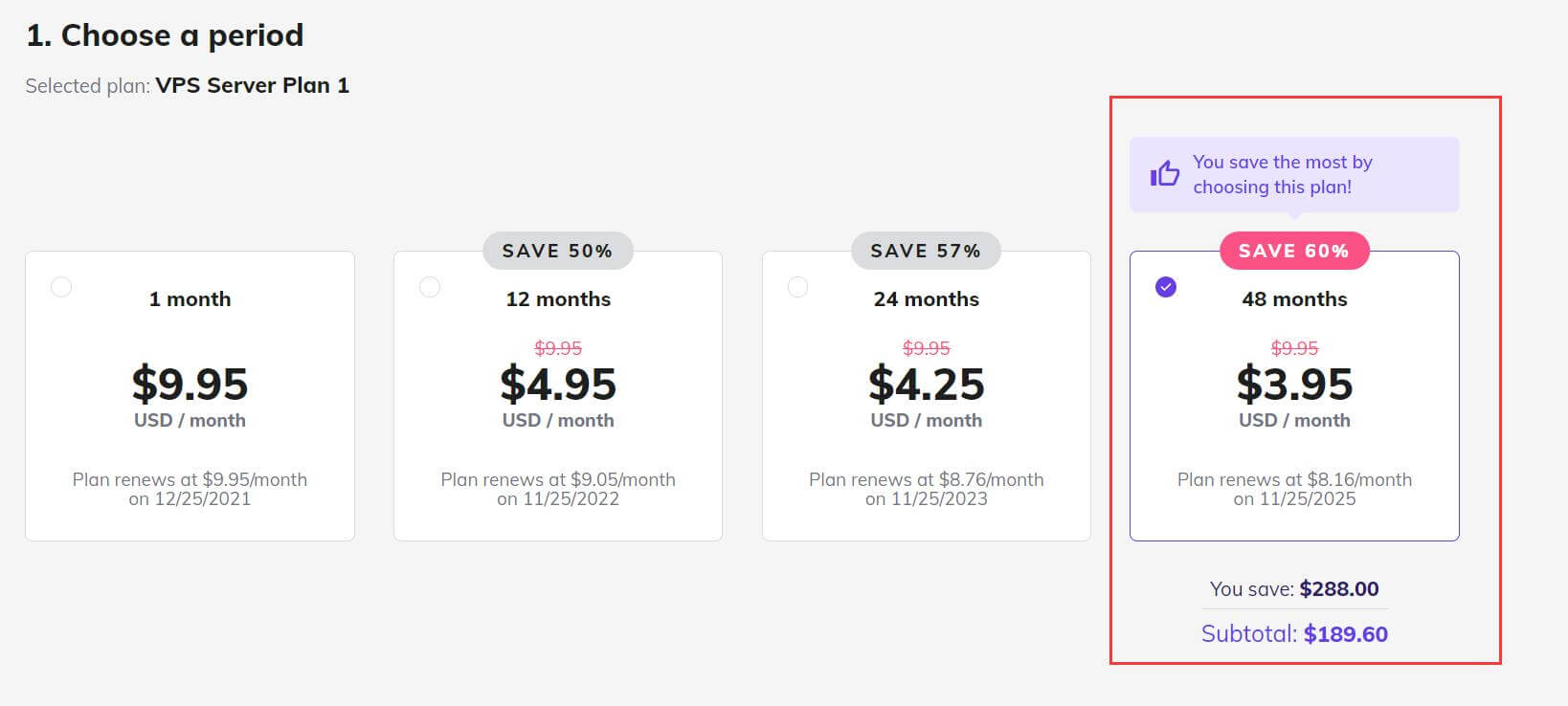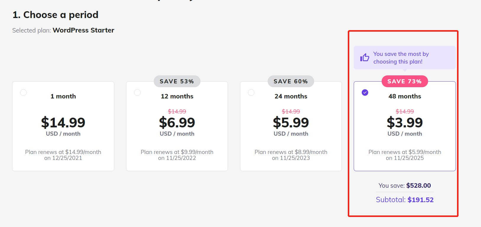 选择你要购买的空间,点击中间那个Select, 我们以第二个套餐为例,3.99美金是Hostinger针对一次性购买两年的价格,买的时间越短,价格越贵。